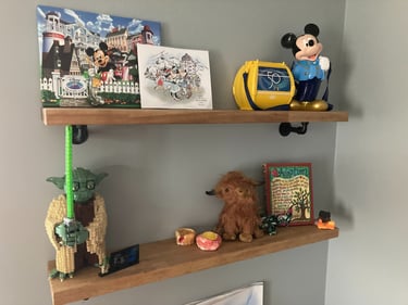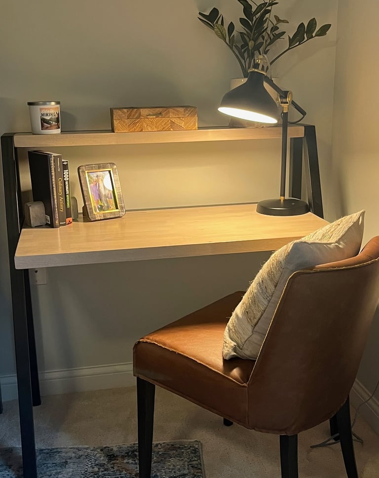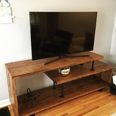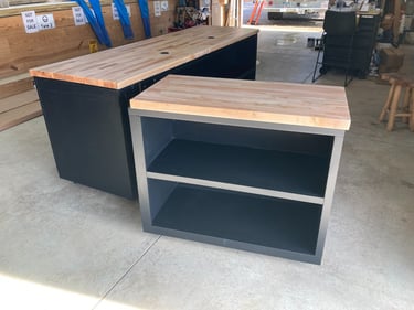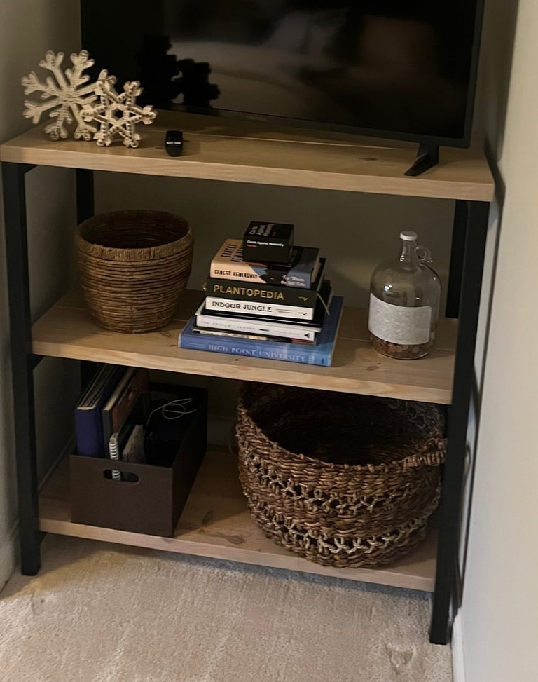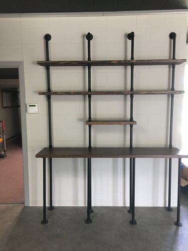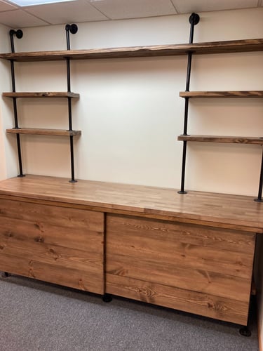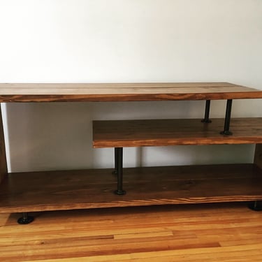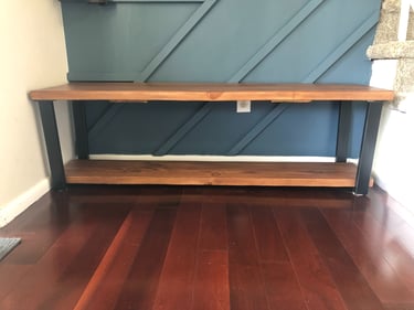 When you have a specific vision in mind, but have specific space and design ideas in need, lets create something that fits the space exactly as you have in mind! This client had 2 wants-a desk area and a new TV stand for a unique corner of their room. We combined a pretty cool steel base with a light wood top for the desk and coordinating TV stand and shelves.